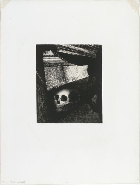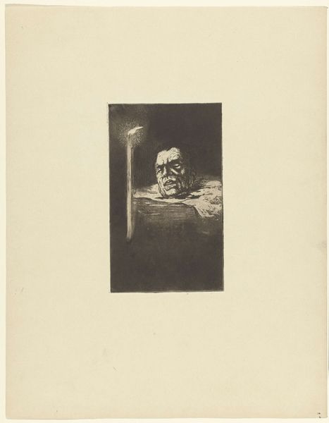 Editor: This is an untitled lithograph, etching and drawing on paper from 1896 by Jean Caldain. Part of a series entitled "Je regardais et je vis..." I find the imagery really unsettling – the stark contrast, the skull-like figure... What do you see in this piece? Curator: This image is definitely meant to provoke. The use of stark contrasts and unsettling imagery is part of a larger artistic movement grappling with the anxieties of modernity, especially at the fin de siècle. Think about what's happening historically: the rise of industrialization, shifts in social structures, and a general questioning of established norms. Doesn't this image feel like a visual manifestation of societal unease? Consider too, the intersection of class and gender, which can be observed in the art from that period. How do you think it's reflected here, even in abstract form? Editor: I can see the unease you describe, in the dark tones and disturbing subject. But where do you see the intersection of class or gender here? Curator: Well, who gets represented—and *how*—is always a political choice. Often this era features women depicted as either fragile beauties or dangerous temptresses. And figures of authority are mocked. The very act of visualizing dread or anxiety in such an expressive way, often countered the societal drive to maintain an ideal composure in light of technological or other advances. Think of who holds power and privilege during this period and the societal pressures on people of other identities. Now how might a figure of, say, repressed anger challenge those power structures by simply existing, scowling in fact, upon the surface? Does that provide more avenues to the analysis here? Editor: That's a great point – that the act of even representing these kinds of anxieties is inherently a challenge to those power structures! I’d never thought of it that way. Curator: Exactly! This seemingly simple image becomes a powerful statement when viewed within its social and historical context. By understanding the broader narratives, we can truly unpack its meaning and relevance, even today.