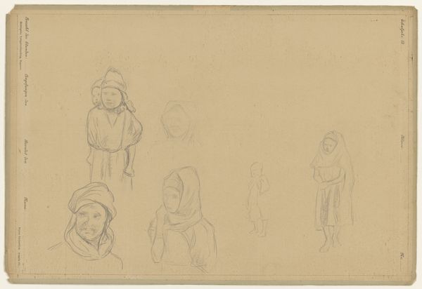 Editor: Here we have "Studienblatt: Köpfe nach Skulpturen, ein Bildniskopf sowie ein untersetzter Orientale," a study sheet by Eugen Eduard Schäffer, presumably from the 19th century, done with drawing on paper. It looks like a page from a sketchbook, with several different studies of faces. It has a tentative feel, like he's experimenting. What catches your eye about this sheet? Curator: It’s fascinating to see this sheet in the context of 19th-century academic art. Artists were trained rigorously through copying sculptures and life drawing. But beyond pure skill-building, these "Oriental" sketches reveal the gaze of Western Europe on other cultures and reflect how they constructed visual narratives around identity. Note the emphasis on particular features deemed “exotic” by Western standards. It tells us as much about Schäffer’s cultural environment as it does about the individuals depicted. Editor: So you're saying that these studies aren't just about honing technique, but also about reinforcing societal views? Curator: Precisely. Art doesn't exist in a vacuum. The public role of art in this period was didactic; it taught morals, it established cultural norms, it constructed stereotypes. The act of sketching these "Oriental" types carries implications about power dynamics and representation. The museum system itself, then in its infancy, contributed to legitimizing these perspectives by collecting and displaying such works. Do you see how the grouping here reinforces this point? Editor: Now that you mention it, arranging the drawings together does put them into conversation. And I see that it challenges the romantic idea of the artist sketching only for personal exploration, suggesting they were thinking of an audience, even unconsciously. Curator: Yes, consider how art academies and salons dictated acceptable subjects and styles. Schäffer was likely positioning himself within that established system while simultaneously absorbing and reproducing its underlying assumptions. Understanding these influences illuminates how art shapes—and is shaped by—society. What will you take away from this piece? Editor: It’s a good reminder to look beyond the surface and consider the historical forces that helped create and promote artwork, because these forces influence what we think we know. Thanks for shedding light on this piece.