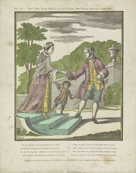 Hermanus Numan created this print in the Dutch Republic, sometime in the late 18th century. Notice how the artist uses a precise linear style to articulate the figures and setting. The composition is structured around a set of stairs, a visual device that literally elevates the wife and son, emphasizing their emotional and moral standing in the scene. The use of line, particularly in the clothing, creates a sense of movement and texture. The formal garden setting is meticulously detailed, providing a stage-like backdrop that enhances the theatrical quality of the departure. Consider how the artist destabilizes traditional notions of family and duty. The act of the father leaving, combined with the son's visible distress, introduces a tension between public duty and private emotion. This tension challenges the fixed values of domestic harmony typically idealized in art. The artwork invites ongoing interpretation about the complexities of familial and societal roles.