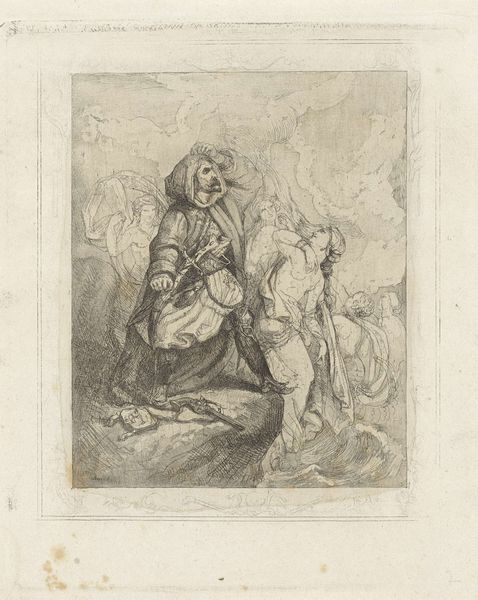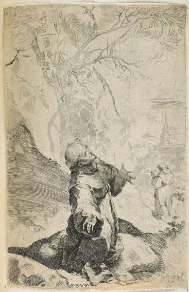 Federico Barocci's etching captures Saint Francis receiving the stigmata, the wounds of Christ, a profound symbol of spiritual union and suffering. Francis kneels, arms outstretched, mirroring Christ's crucifixion, as divine rays pierce him. Consider the recurring motif of raised hands throughout art history. In ancient Egyptian art, raised hands signified adoration; in early Christian art, they denoted prayer. Here, Francis's gesture merges both, embodying his ecstatic devotion and receptivity to divine grace. The wounds themselves, appearing on his hands and feet, are a visceral echo of Christ’s sacrifice. The act of bearing witness is another crucial element, found across cultures. These witnesses, in the background, represent the importance of shared experiences, mirroring ancient rituals where communal witnessing validated events. This image resonates deep within our collective psyche, a visceral symbol of empathy, sacrifice, and the enduring quest for spiritual transcendence.
