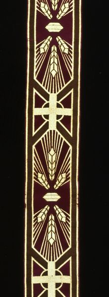 Editor: We’re looking at "Trim," a textile ornament probably made around the 20th century by the Sisters of the Order of St. Benedict. It’s got this beautiful vertical design, rich reds and golds, and these fascinating, almost heraldic looking creatures repeated along its length. It feels very… regal, somehow. What jumps out at you when you look at this, particularly considering its place within a religious order? Curator: Ah, "regal" is such a fascinating word to use. It DOES possess a certain quiet authority, doesn't it? It makes me wonder, what does it mean to imbue a religious object with that sort of power? Look closely at those stylized creatures. Are they guarding something, perhaps? Or perhaps, these figures and ornate details served as a tangible link to the divine for the people using or viewing them. What do you think, does that read as pompous or comforting to your sensibilities? Editor: I see what you mean. Guarding something… maybe not physical treasure, but symbolic or spiritual purity? Comforting, I think, ultimately. Like a beautiful, intricately woven prayer. The craftsmanship alone must have been meditative. It also places artistic labor at the service of their faith. Curator: Exactly. This is more than just pretty fabric. Think about the repetitive nature of the design. How does that resonate with the routines and rituals of monastic life? What I appreciate the most is the intentionality imbued into it. Editor: So, it’s less about the individual maker and more about the collective devotion expressed through art. I hadn't considered it that way! Curator: Precisely. And by contemplating these figures, we get a small glimpse into how visual design affects daily rituals, both within monastic orders and our lives. The artist has certainly provided something unique to admire and analyze.