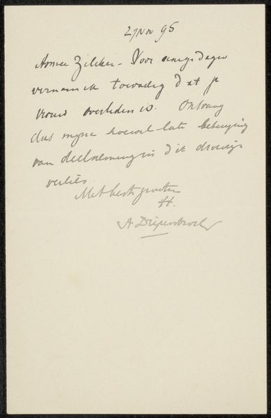 Curator: What a delicate and heartfelt piece we have here. It's "Brief aan Philip Zilcken" by Frederik van Eeden, rendered in ink on paper, likely sometime after 1904. The Rijksmuseum holds this treasure. It looks like he wrote this in sorrow. Editor: Sorrow indeed, palpable in every stroke. The muted greys of the ink bleeding into the paper evoke a somber mood, almost like a veil over the words. It feels intensely personal. Curator: It is. Van Eeden was writing a letter of condolence. You can see the address printed at the top: "Dennekamp, Bussum." And beneath that, the handwritten text, a lament for the deceased recipient. Editor: Look closely and one notices the social conventions at play here. Van Eeden conveys a traditional message of sorrow. He shares condolences "van onse deelneming". His handwriting shows careful, controlled grief – a performative empathy constrained by the cultural expectations of mourning at the time. Curator: Yes, beautifully put! You know, his script seems to reveal something intimate too, like a window into his soul during that time of loss. Each dip and curve seems weighed down with emotion, reflecting the emotional burden of that specific moment. The writing looks sad and comforting at the same time, it sounds bizarre but, it felt comforting as if I wanted to hold the person whom this was adressed. Editor: Precisely! But it also prompts broader reflections on grief rituals. The letter underscores the gendered expectations, then and now. We need to ask how access to emotional expression differs along intersectional axes of race, class, and gender. Curator: I never considered such! You gave the letter a total new definition. Looking into what lies hidden. Thank you for illuminating the bigger perspective and turning my emotions into questions. Editor: We've only scratched the surface, honestly, but in these small glimpses, history whispers secrets, asking to be retold and reimagined in our present.