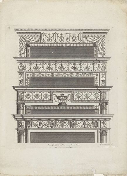 Editor: So, this is "Friedenssaal te Munster waar de vredesonderhandelingen gevoerd zijn, 1643-1649", by Georg Daniel Heumann, created around 1735. It's an engraving, a highly detailed drawing of a hall...it almost feels like a stage set, so precisely rendered in perspective. What stands out to you most when you look at this piece? Curator: Ah, the Friedenssaal! To me, it’s less about accurate depiction, and more a baroque dream of power, peace, and space – like stepping into a grand theatrical production. You mentioned the precision; notice how Heumann uses linear perspective almost obsessively? Editor: I do. It’s incredibly formal, maybe even a little overwhelming? Curator: Exactly! The receding lines pull you into the distance, towards the suggestion of endless space. The shields lining the hall add to this, framing the space with symbolic representation. Now, imagine this space buzzing with diplomats. Editor: It's hard to imagine any buzzing going on. It's so rigid and structured! The shields, almost like staring eyes, watch the discussion unfold. Did all this order help reach peaceful negotiations? Curator: An interesting question! Maybe this staged performance of power actually smoothed the path towards peace by instilling a sense of importance and inevitability. A potent suggestion, though! And consider, isn't every peace negotiation its own stage performance in a way? What do you think the artist aimed to highlight about the conference itself? Editor: I hadn't thought of it that way, that negotiations were also performances! Perhaps this drawing served as a commemorative marker of peace negotiations that altered history. I guess that's what I learned looking closely. What do you take away from this? Curator: Precisely. We get to appreciate how art can intertwine with and interpret historical and political narratives, reflecting both the tangible space and the aspirations embedded within it. Now, wasn’t that a fascinating perspective?