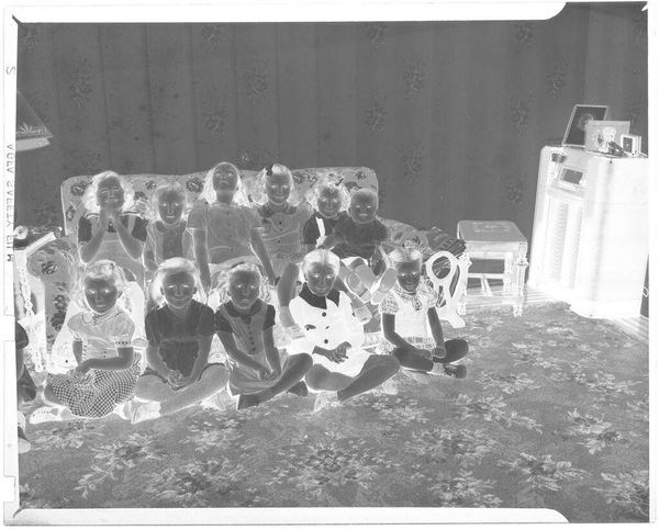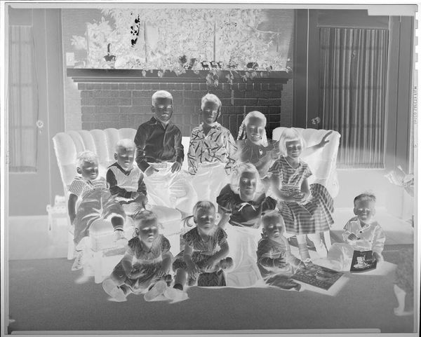 Editor: This photograph by Martin Schweig captures seven young children in front of a Christmas tree. Its inverted tones give it a ghostly quality. What symbols do you see at play here, considering the cultural weight of Christmas? Curator: The inverted image disrupts our cozy expectations. Note the repetition of figures. In numerology, seven represents completeness, spiritual awakening. Schweig uses it to explore collective memory. What new meanings emerge from this inverted scene? Editor: It’s like a flipped mirror of childhood innocence, hinting at something unsettling beneath the surface. I hadn't considered the weight of repetition before. Curator: Exactly, familiar imagery can become unsettling when recontextualized, forcing us to confront hidden anxieties within cultural traditions.