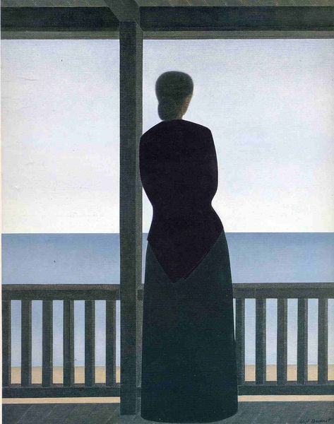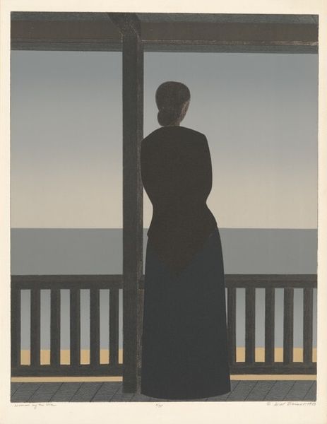 Editor: This is Will Barnet's 1983 print, "Peter Grimes." It's incredibly stark; the figures are so rigid against this muted landscape. What do you make of it? Curator: The scene certainly evokes a sense of isolation. Consider the title, connecting us to Benjamin Britten’s opera. Grimes, a social outcast, embodies alienation. Look at how Barnet simplifies the figures, reducing them to near-geometric forms. Doesn't it feel like he's depicting archetypes rather than individuals? Editor: Yes, they almost seem like symbols themselves. The two women especially, standing together but also so separate from the lone figure. Curator: Exactly. And the landscape! Flat, almost oppressive. This reinforces the emotional weight. The gray palette, reminiscent of lithography, suggests a shared cultural memory, almost a premonition of doom. It's not just a depiction of figures in a landscape; it becomes a symbolic representation of human existence, fraught with isolation and societal pressures. What stories might these shapes evoke for you? Editor: It makes me think about how social conventions can isolate people, how judgment can create these divides. Maybe it's a comment on the enduring nature of those dynamics. Curator: Precisely! The symbolic power lies in the way Barnet uses visual language to speak to timeless and universal human experiences. It highlights how symbols embedded within the image are not just artistic devices, but cultural containers that accumulate meaning over time. Editor: I didn't expect a simple landscape to carry so much meaning! Curator: Art often holds a mirror to ourselves and society. It reflects what was, what is, and potentially what could be, using symbols as its language.