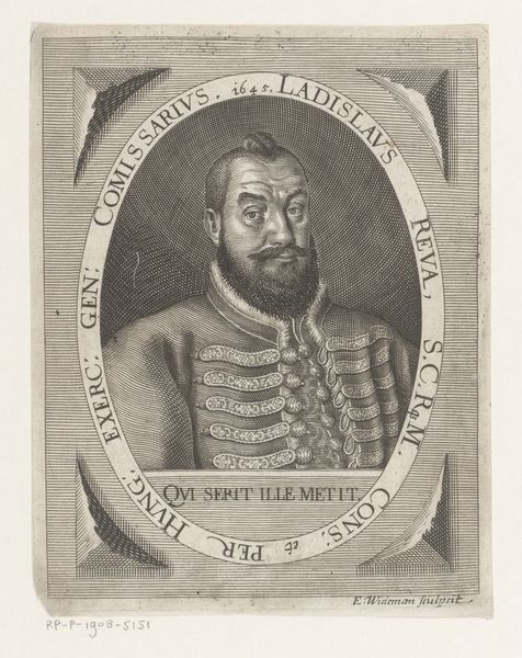 Curator: Here we have "Portret van Peter Mariany," a Baroque engraving created in 1647 by Elias Widemann, currently residing at the Rijksmuseum. Editor: It's striking. The level of detail in such a small-scale work, especially in the hatching used to render Mariany’s beard, creates a rich texture and a strong sense of presence. Curator: Indeed. The artist's meticulous use of line, the deployment of varied thicknesses, and the modulation from dense cross-hatching to areas of pure line articulate form in a remarkable manner. The oval border that contains the portrait itself contributes to the sense of contained intensity. Editor: The materiality of printmaking is very apparent. You see every line the artist made, the physical labor involved in scoring that copperplate. There’s a real sense of craft, almost industrial given its reproducibility, but undeniably handmade. The lettering feels integrated into the piece rather than merely added information. Curator: Precisely. Note how the lettering’s curvilinear arrangement contrasts and complements the angular geometries visible elsewhere in the border, enhancing its visual impact. And the balance achieved by deploying these geometric and non-geometric shapes makes this Baroque composition particularly noteworthy. Editor: I'm also interested in how the portrait flattens certain aspects while accentuating others. The ruff is so meticulously rendered, but the body seems almost like a dark, flat plane on which the face hovers. It serves to isolate and elevate the subject's countenance. Curator: Observe, too, how the textures in the portrait dynamically intersect to shape the viewer's gaze—that textured surface, the fine incisions, work together to shape an overall impression of both form and content. Editor: So, beyond its immediate visual impact and impressive artistry, one can’t forget its socio-political context, a tangible remnant of a world transformed and preserved. Curator: An exemplary application of aesthetic refinement, executed with notable precision, invites repeated inspection. Editor: I appreciate its handmade quality preserved, reminding us that the mechanization of art production doesn’t negate the value or impact of labor.