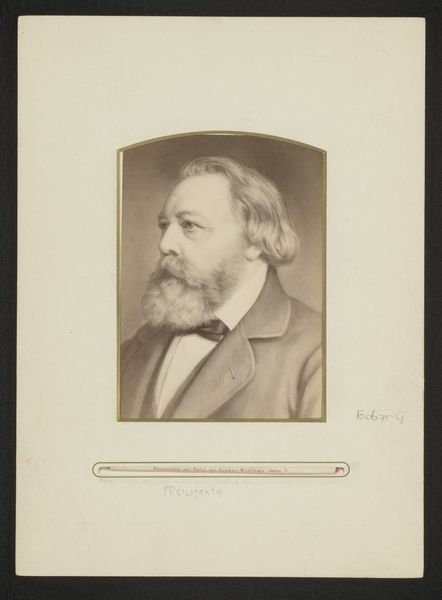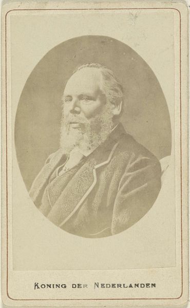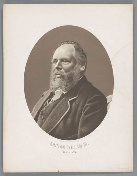 Curator: It's hard not to be immediately struck by the formality and weight of this photographic portrait. The sepia tones lend a historical distance, don’t you think? Editor: Absolutely. It has that imposing air of 19th-century portraits, certainly. Let's unpack it. This is a portrait of Willem III of the Netherlands, created sometime between 1874 and 1876. It’s held here at the Rijksmuseum, a perfect setting, I think, given its historical import. Curator: From my perspective, what’s really captivating is thinking about the materiality of a photograph like this from that period. We’re so used to instant images today. Consider the equipment, the chemicals, the sheer amount of time it would take to produce such a thing! Each photograph was an intensive labor, creating what amounts to a singular, almost precious object. Editor: And think about the social ritual surrounding it! A king wouldn’t just casually pose. The sitting itself becomes a performance, a reinforcement of power through carefully constructed imagery. Note how his gaze seems averted yet simultaneously dignified; the implicit message is control and strength. We could even investigate what studio was contracted, who the photographer was and their access to the Royal court. Curator: Exactly! And how the production of these images quickly industrialized through studios catering to a rising bourgeois class! One thing that gets less discussion is how this artwork complicates established norms. You had a powerful figure represented in, back then, a new medium. The photograph could be endlessly reproduced as a kind of propaganda, while being hand-touched as a crafted object. It exists within boundaries! Editor: Right. The politics of imagery! We cannot ignore the symbolic work this photograph performed in solidifying the monarchy's image for the people, playing its crucial part in a time of rapid social change. It uses the realism offered by early photography as a means to solidify traditional ideals in the face of revolution. Curator: It certainly provokes a meditation on labor, industrial production, and photography, something often elided in art criticism when dealing with more "painterly" mediums. Editor: Thinking about the museum context helps one better understand its public life too. Willem III appears within and reinforces national history itself through these walls. Curator: An engaging artwork to deconstruct! Editor: Indeed, a striking intersection of history, power, and early photographic techniques.
