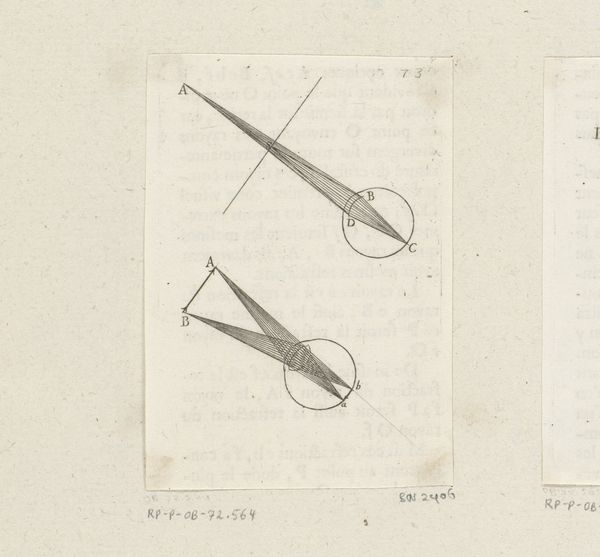 Here we have a delicate engraving by Sébastien Leclerc I, made at an unknown date with the graphic medium of the engraving technique. Engraving is a printmaking process that involves using a tool to incise a design onto a metal plate, which is then inked and used to create an image on paper. The intricate lines and precise details are a testament to Leclerc's skill in manipulating the engraving tool to render complex scientific subjects. The material properties of the metal plate – its hardness, its ability to hold fine lines – directly influence the clarity and accuracy of the final print. The production of engravings was a labor-intensive process, requiring specialized knowledge and craftsmanship. The image itself depicts a theory of vision, of a ray of light hitting the retina. The intellectual labor involved in creating this image speaks to the cultural significance of scientific knowledge and the role of visual representation in disseminating ideas during the Enlightenment. It's important to recognize how methods of production and intellectual and aesthetic expression were intertwined at the time.