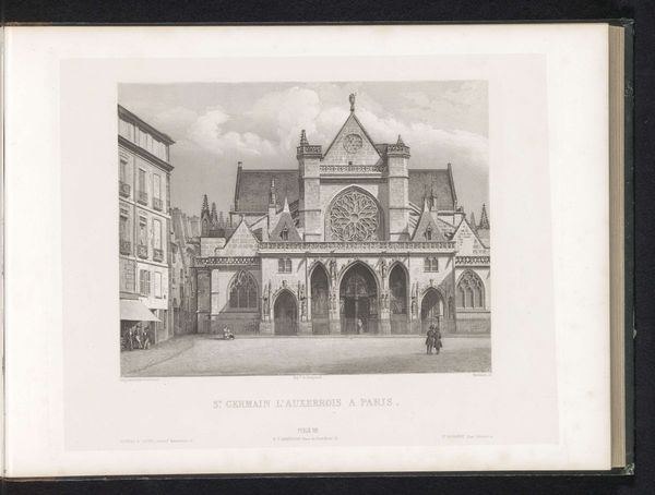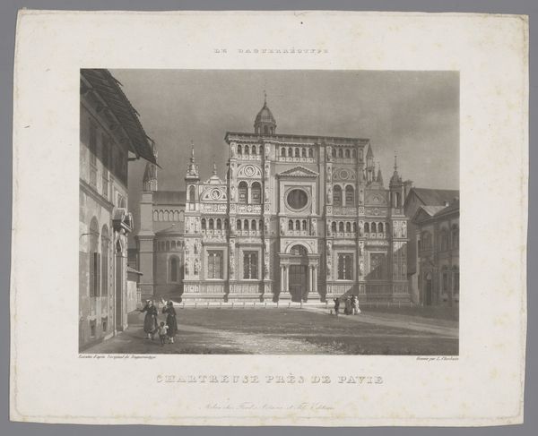 Editor: So, this is a print from before 1841, depicting the Voorgevel van de Église Sainte-Croix in Bordeaux, by Sigismond Himely. It looks like it was made using etching and drawing on paper, possibly "en plein-air"? I'm immediately struck by its somewhat somber tone, and the sheer monumentality of the architecture against the comparatively smaller human figures. What details stand out to you? Curator: Well, it sings to me of a lost world, doesn't it? The Romantic period, obsessed with the past, capturing this building... it feels almost archaeological, like we're discovering it anew. The light, the artist capturing a sense of place and time! Did you notice how Himely contrasted the weighty Romanesque architecture with those delicate etched lines? It's a beautiful dance between strength and fragility. Editor: It definitely feels like more than just a straightforward depiction. There’s a sense of… reverence, almost? Curator: Precisely! Romanticism wasn't just about pretty landscapes. It was about feeling, about history, about the sublime. He’s not just showing us a church; he’s inviting us to feel its weight, its history, its...mystery, to find something ancient still living and breathing in his time. A little melancholic reminder of history's silent endurance. I wonder, what do you take away now from seeing it through a historical lens? Editor: I think understanding that Romantic yearning makes the contrast between the huge building and the small figures even more poignant. It's like, the fleeting present against the backdrop of enduring history. I guess I didn't see that depth initially. Thanks! Curator: My pleasure! It is all there, if you want it, buried just beneath the surface. Just gotta blow the dust off it.