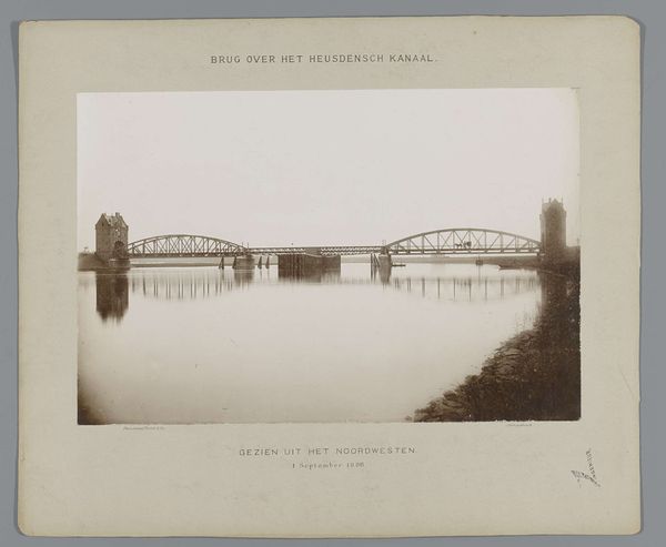 Curator: This photograph, taken somewhere between 1885 and 1900, captures the "Spoorbrug in Belawan, Sumatra" which translates to "Railway bridge in Belawan, Sumatra". The photographer is Carl J. Kleingrothe and the print you're seeing here is a gelatin-silver print. Editor: Immediately, I’m struck by the almost melancholic stillness of the scene. It feels so remote, like stepping into a forgotten moment in time. That low, misty horizon and the glassy river amplify the solitude. It’s quite haunting, really. Curator: It’s a potent visual representation of colonialism and technological advancement, seen through an Orientalist lens. The bridge signifies the imposition of Western infrastructure upon the Indonesian landscape. How does the presence of people inform the image? Editor: The people in the boat ground the picture. Their presence is very human amid all of this cold steel and ordered structure of the bridge. Do you notice the strange light illuminating their figures in contrast to the very muted bridge? Curator: Absolutely. I think it’s fascinating how photography was wielded as both a documentary tool and a means of aestheticizing the colonial project. This image operates on multiple layers, showcasing technological progress while subtly reinforcing power dynamics. The composition guides our eye along the rigid bridge into the flat and seemingly never-ending landscape. The bridge is visually "swallowing up" Sumatra, if that makes sense. Editor: I hadn't quite thought of it like that, swallowing Sumatra... Yeah, that does make sense. To me, the beauty and sense of stillness outweigh those things, but I totally get that there's a lot more going on beneath the surface. Kleingrothe is asking us to unpack some stuff. Curator: Precisely. It makes me consider the ethics of looking—what do we choose to see and how does our perspective influence our interpretation? Editor: And maybe even more simply, the reminder to think about the baggage our beautiful views and images carry, literally. Curator: Very true! An important and vital observation.