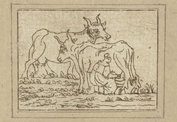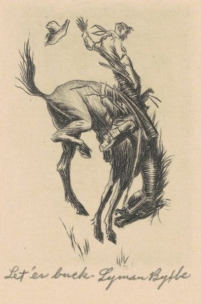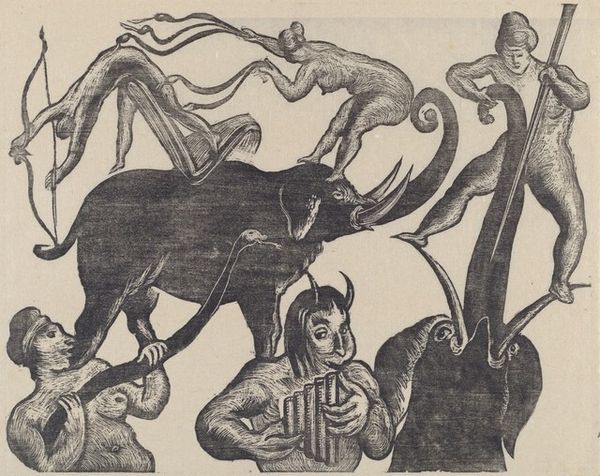 This is "Gargantua: Chapter IV", a woodcut made by Bernard Reder. The dominant impression is one of dynamic tension. A massive, dark bull overwhelms the composition, looming over a crouched figure with spiky hair. The stark contrast between the black ink and the pale background heightens the drama. Reder uses bold lines to define the shapes, creating a sense of weight and volume in the bull, and vulnerability in the figure below. This formal arrangement speaks to the themes of power and subjugation. The bull, rendered in thick, textured strokes, seems to embody brute force. The figure's posture, a mix of resistance and submission, is conveyed through the angularity of the body and limbs, emphasizing the figure's struggle within the composition. The visual tension suggests a questioning of hierarchical structures. Is it a celebration, critique, or observation of power dynamics? The work remains open to interpretation.