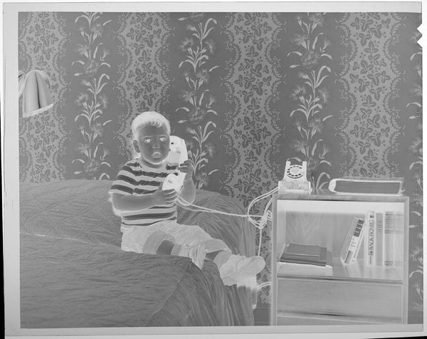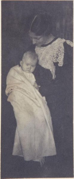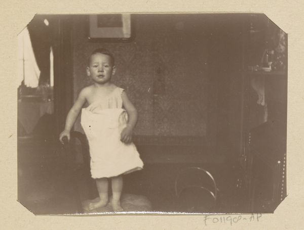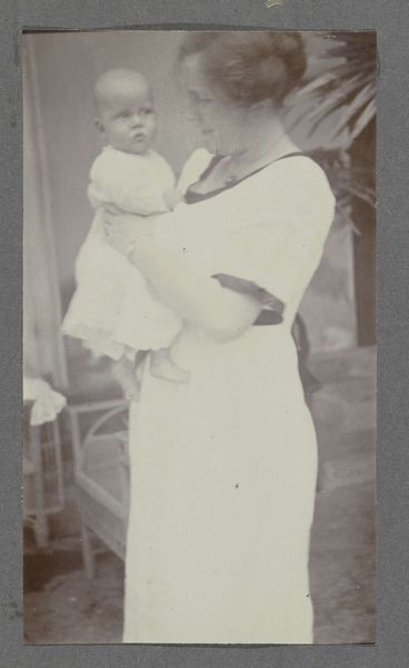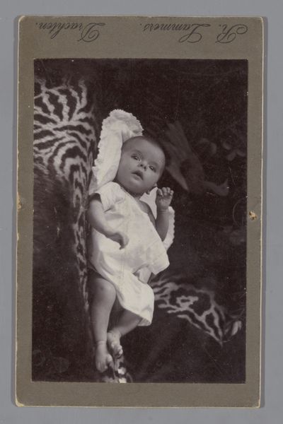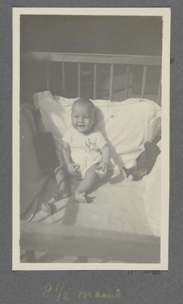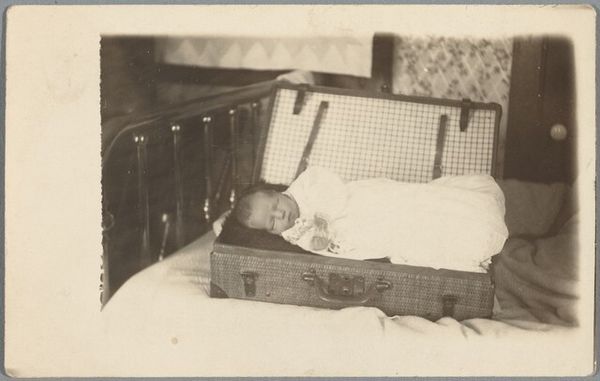 Curator: Immediately, there's an arresting sense of fragility to this monochrome image. The soft focus lends a dreamlike quality. Editor: This is a photograph by Theodoor Brouwers, likely taken sometime between 1913 and 1930. The albumen print is titled "Gerard Brouwers, de pasgeboren zoon van Theodoor Brouwers," so it appears to be a portrait of the artist’s newborn son. It resides here at the Rijksmuseum. Curator: The starkness of the black and white amplifies the vulnerability of the baby. Notice the contrast between the crisp, iron frame of the bed and the delicate limbs. There is the implied tenderness that often accompanies images of newborns but there's also, in the photographic realism, the implicit awareness of how brief and mutable early childhood can be. Editor: I am struck by the compositional elements. The strong horizontal of the bed is juxtaposed with the soft vertical fall of the sheets to the side of the crib and the bed's wrought-iron frame. Curator: Irony and expectation converge in the imagery of a child's bed and what it traditionally implies-- dreams and purity. Given the history we know now of infant mortality through time, it's difficult to not see an undercurrent of cultural memory here. Editor: The almost clinical presentation is very interesting, as well. One notices that Theodoor meticulously recorded details that one would maybe not initially look for; the light, shape of the head. The artist’s realism shows us something essential, beyond sentimental or performative gesture. Curator: Precisely. It shows a dedication to recording that specific moment, layering realism with the deep symbolic weight associated with infancy and paternal observation. Editor: Ultimately, whether intentional or not, Brouwers’ image uses the formal photographic method to hint at the fragile beauty of existence, as stark, but beautiful and inevitable as these lines. Curator: An astute reflection. By pairing his objective perspective of style, and his paternal one, Brouwers preserves in light what easily, inevitably, fades from memory.