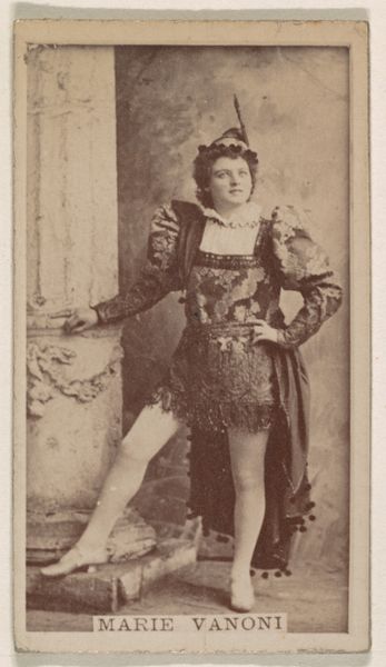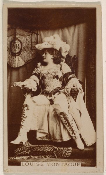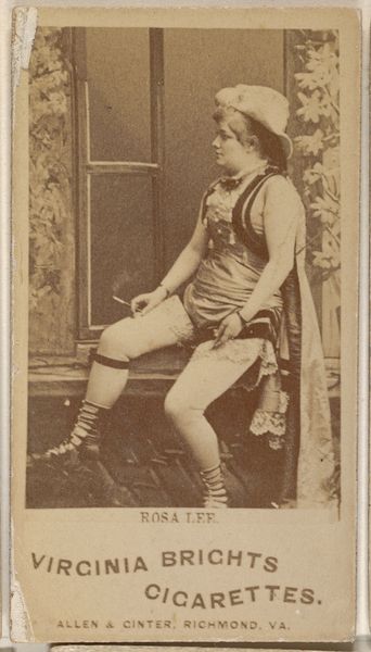 Curator: What strikes me immediately about this printed photograph from the late 1880s, made by Allen and Ginter, is how effectively it merges portraiture with a blatant advertisement. Editor: Yes, that odd juxtaposition definitely commands attention. It's of Emily Young from the Actors and Actresses series to promote Virginia Brights Cigarettes, but despite that utilitarian purpose, it projects such a quiet, almost melancholic air. Curator: It is the sitter's posture that gives it that air, isn't it? The slightly slouched pose, the hand resting pensively on her face. Compositionally, she forms a distinct diagonal, softened only by the subtle curve of her torso. Her look has been strategically manufactured as an open semiotic text. Editor: And it’s interesting how even then, performers like Young carried such powerful cultural weight. By visually aligning her with a commodity, they're essentially saying, "Consume this, and you consume a piece of her world, her glamour." In that pose, however, there seems to be little glamour. I read a coded resistance in her presentation. Curator: I'm intrigued by the etching-like ornamentation on her sleeve and torso, repeated on what appears to be a stage prop beside her. Those details introduce a critical layer of texture into an otherwise subdued palette. Editor: Symbols of status, certainly, but within a rapidly democratizing public sphere. I wonder, did she see the use of her image this way? Did she recognize her face becoming another component in this advertisement? There is something rather voyeuristic about it. Curator: It's easy to apply our contemporary lenses, but even without knowing Young's perspective, the image resonates structurally, as an almost perfect intersection of art and commerce, achieved with minimalist technique and the stark clarity of nascent photographic processes. Editor: The implications, really, still reverberate today. Our icons become slogans and then they sell us an intangible something which echoes and magnifies cultural expectations. Curator: It is hard not to appreciate how, more than a century later, those core structures, that formal relationship, are very much still at play. Editor: And that’s how we remember these seemingly insignificant moments, their patterns woven so subtly into the fabric of culture.