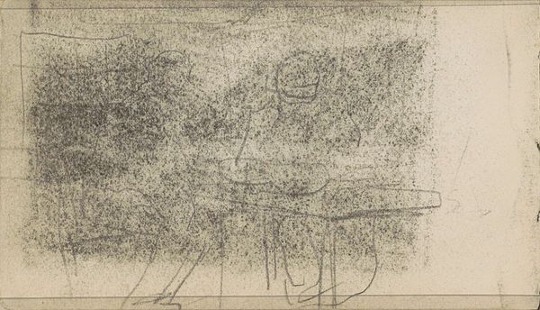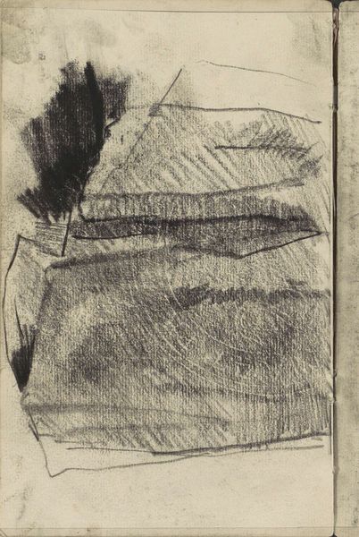 Curator: Welcome to the Rijksmuseum. We are standing before George Hendrik Breitner's "Studie, mogelijk van figuren bij een gebouw of kraam," created around 1886 to 1890. Editor: My first impression is of transience. The rough lines and incomplete forms give a sense of something quickly captured, fleeting. The medium accentuates it all. Curator: Indeed. Let’s consider those very formal aspects. The sketch appears almost cubist in its reduction of forms to near-geometric shapes. Note the bold, contrasting areas of light and shadow defining the architecture. It evokes a semiotic tension between representation and abstraction, wouldn’t you agree? Editor: It is definitely the materiality that draws me in. The humble pencil on paper emphasizes process, immediacy. Think about the act of sketching outdoors, the physical labor of rendering what Breitner observes. This isn't some high-art oil painting in a studio; it is closer to craft, a direct record of interaction with the environment. Curator: While I appreciate your focus on materiality, let us not dismiss the underlying structure. The strategic arrangement of light and shadow dictates the piece. If you look at how he used these, he essentially designed entry points and how your eyes travels from one element to another on this paper. The perspective, though gestural, still informs our understanding of space, which he managed very skillfully. Editor: It is also valuable to consider what’s not there, and not only in what we see physically rendered. The open areas, the negative space, provide balance, right? They imply movement of the body, of course, with their placement hinting at locations and positions in order of how he was perceiving reality at this moment. Think about the cost of materials too—paper and pencil are economical and easily accessible. Does that impact his subject? Curator: Certainly, the work does highlight that inherent dialectic, if only as a result of its medium, scale, and construction. Breitner seems to be less involved with creating "high art" as it were and instead captured a single, and as you so rightfully observe, transient impression. The structural framework that gives shape to this work cannot be dismissed either. It showcases the way he used contrasting form as an expression technique, and this in its core elevates it beyond being just a study. Editor: Agreed. So perhaps, rather than separate endeavors of making versus seeing, these are always intertwined considerations. Each sketch represents a single lived moment. The economic choices influence artistic direction just as his expression defined it all.