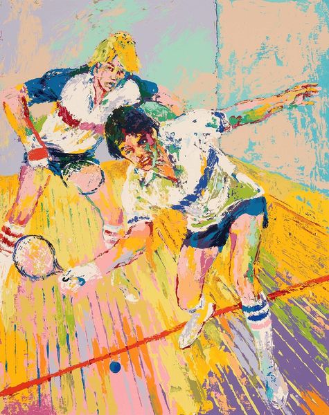 LeRoy Neiman’s painting "Kentucky Wildcats" captures a basketball game in a burst of dynamic energy using oil paint. The scene is a whirlwind of movement, achieved through Neiman’s vibrant color palette and expressive brushstrokes. These techniques draw the viewer into the intensity of the game. Neiman uses a fragmented approach to depicting the players and the arena. He is less interested in realistic representation, and instead focuses on conveying the speed and excitement inherent in the sport. The composition is built around a series of diagonal lines which adds to the feeling of instability and action. The painting is not just a depiction of a basketball game; it is a semiotic expression of the heightened emotional and physical state of competition. Neiman challenges the traditional, static portrayal of sporting events. He presents a more abstract, dynamic interpretation. The unfinished quality of the brushwork disrupts conventional expectations of finish and detail. The overall effect is a painting that captures a moment in time, but does so through a lens of abstraction and heightened emotion. The way the painting destabilizes the line between representation and abstraction encourages the audience to consider the many ways an event can be perceived and interpreted.