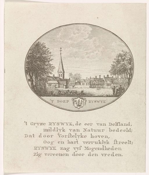 Anna Catharina Brouwer created this print of Hendrik-Ido-Ambacht. The composition is strikingly simple, isn’t it? The village scene is neatly framed within an oval, immediately drawing our eyes to the detailed rendering of the buildings, trees, and figures. The print's monochrome palette accentuates the linear quality, the lines etched with precision to define the forms and create depth. Now, consider how this formal structure might relate to broader artistic and philosophical ideas. In the 18th century, printmaking was a key medium for disseminating knowledge. The clear, concise lines and ordered composition reflect Enlightenment values of reason, clarity, and the systematic organization of information. The detailed representation of the village can be seen as a kind of visual inventory, cataloging the world in a rational and objective manner. Notice how the circular frame contains and orders the scene. It suggests a world neatly categorized and understood. Yet, art is never entirely fixed in its meaning. This print, with its blend of detailed observation and structured composition, invites us to reflect on how we perceive and represent the world around us.