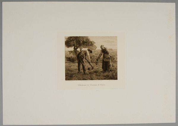Editor: This is "Gleaners" by Flora? Reynaud, housed here at the Harvard Art Museums. I am struck by the depiction of labor and the seeming vastness of the field. What can you tell me about the piece? Curator: Looking at this print, consider the labor involved in both the gleaning depicted and the printmaking itself. Reynaud’s choice of this subject matter, and the reproducibility inherent in the medium, invite us to contemplate the social context of agricultural work. Editor: That’s an interesting perspective. I was focused on the figures themselves. Curator: What about the figures' postures, their clothing, the tools they use? Doesn't this point to a reality of work and social class? Editor: I see what you mean. Thinking about the process and materials, it reframes the image entirely! Curator: Exactly. By understanding the means of production and the social implications, we gain a deeper appreciation for the artwork.