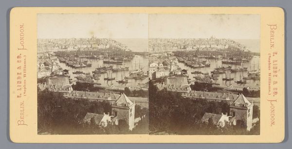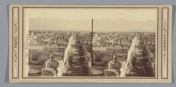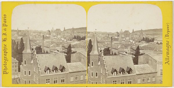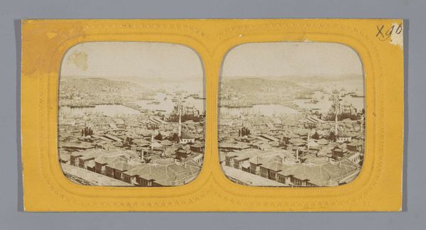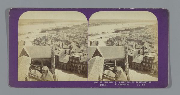 Curator: This is Charles Dauvois' "View of Paris with the Church of Saint-Eustache," a gelatin silver print, made sometime between 1863 and 1880. Editor: My immediate impression is one of texture, really – a dense fabric woven from the roofs and facades. It is incredibly compact; the buildings seem to breathe into each other. Curator: Precisely! The stereoscopic format invites a deeper analysis. Notice how the church serves as a compositional anchor, providing visual stability amid the urban sprawl. The geometric precision of the buildings creates this sense of order. Editor: I'm also struck by how this medium, this process of the gelatin silver print, democratized this view of the city. The relatively new ability to mass-produce images put Parisian life within reach for people far beyond the capital, didn't it? One wonders what working conditions looked like. What chemicals were those early photographers handling? How long did each print take to finalize, considering all steps? Curator: Excellent considerations. Photography, and its materiality, also transformed painting, did it not? It forced a reevaluation of representation and artistic vision; for example, one could argue the play of light in impressionism responds to these early photos. Editor: Absolutely. We tend to think about the "subject" of photographs, but thinking of the photographers and lab assistants creating these en masse adds a really valuable texture to what's in the print, its composition. Their invisible labor literally developed what we see before us! Curator: It reveals how the seemingly objective representation relies on the artist's intentional construction, guiding our gaze towards symbolic elements of cultural and architectural significance. Editor: Thank you for highlighting the complexities and material realities hidden within what at first seems a straightforward image of a familiar city. It opens up all sorts of avenues of reflection, doesn't it? Curator: Indeed. Hopefully, the artwork inspires all of us to question and appreciate the multiple layers of history captured within seemingly simple art.