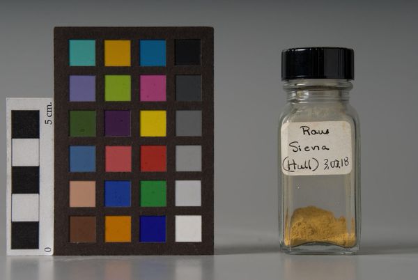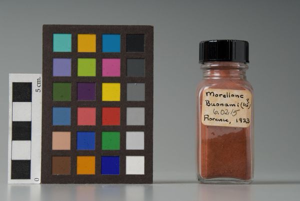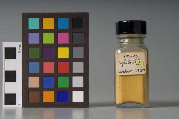 Curator: The Harvard Art Museums hold this intriguing item manufactured by F. Weber & Company, called "Mars Yellow." It’s a jar of pigment dating back to 1930, presented alongside a color calibration chart. Editor: It feels so sterile and clinical, yet there's something quite evocative about a single jar of pigment isolated like this. The label is aged, giving it a tangible sense of history. Curator: Exactly. Weber's Mars pigments were significant in art history because they were among the first synthetically produced colors. Iron oxides, created in the lab, gave artists greater control and consistency in their palettes. Editor: It speaks to a shift towards industrialization, even in artistic production. Who had access to these materials, and how did that impact the art being made? Were they more consistent in quality, or considered less valuable than natural pigments? Curator: That's the critical question. Synthetic pigments democratized color, making it more accessible, but also potentially altered the perceived value and authenticity within the art world. Editor: It also makes me consider how the industrial production of art materials contributed to pollution, something we are still grappling with today. Curator: Indeed, seeing it from that perspective, this seemingly simple jar opens up a complex history of art, industry, and environmental impact. Editor: A tiny jar holding such a big narrative.