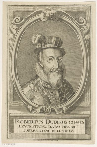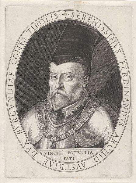 Curator: Good morning. We’re looking at Jan Punt’s “Portret van Karel V van Habsburg, Duits keizer, koning van Spanje,” from 1748, housed right here at the Rijksmuseum. Editor: What strikes me first is its meticulous detail— the delicate lines composing Charles V’s face, and the intricate patterns adorning his regal attire, it really encapsulates his royal presence and commanding nature, even as a monochrome print. Curator: Indeed. Punt was working within a long tradition of depicting Habsburg rulers, each portrayal reinforcing dynastic power. The print itself functioned as a widely accessible medium, circulating the image and authority of the Emperor across geographical boundaries. Editor: The oval frame contains the figure so rigidly; that emphasizes the verticality. His expression seems stoic, a perfect embodiment of power and restraint. How fascinating that simple hatching can convey so much texture. Curator: Precisely. Prints such as these served as powerful tools for shaping public perception. Think about the proliferation of such imagery: How many people throughout the Habsburg territories might have encountered this likeness of their ruler, fostering a sense of connection—or perhaps resentment? Editor: It's amazing to see such detailed artwork done on aged paper; The etching creates an aesthetic of dignity and time depth, also, notice how the shading renders volume, especially in the folds of the garments. This elevates the two-dimensionality. Curator: I am captivated by the political agency enacted here. Consider the Dutch context too: This image made the Dutch readership both see and understand Charles V from the perspective they thought important at this moment in history, to them and the current government and administration. Editor: What begins as simple illustration thus becomes quite a complex presentation and political declaration. Thanks to these layers we have a lot to interpret. Curator: Thank you, and the play of the lines to emulate the feel is masterful as we discussed. This gives us much to reflect on concerning not just this Habsburg, but print as a whole medium!
