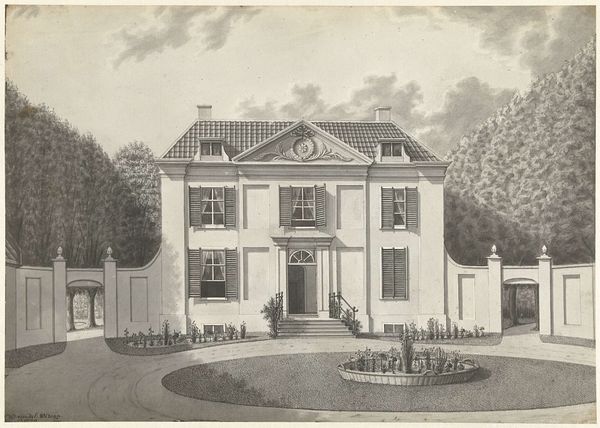 Editor: This is J. J. Lankes’ woodcut, "Selma Lagerlof Home," created in 1926. The high contrast between light and dark areas gives the image a striking quality, almost like a photograph negative. What stands out to you about this piece? Curator: The woodcut as a medium is so interesting. Look at how Lankes leverages it to depict not just the form of the house, but also the labor involved in building and maintaining such a grand estate. The textures he achieves through carving—the roof tiles, the grass—all speak to the process. It becomes a commentary on class and ownership through the very act of making the image. Editor: So, the labor isn't just represented in the subject matter, but also in the creation of the artwork itself? Curator: Precisely. The sharp, deliberate cuts of the woodblock emphasize the hand of the artist, engaging directly with the material in a way that mirrors the construction of the house. It moves beyond a simple landscape. How does this detailed attention to material and process shift our understanding of 'home'? Does it become less about warmth and more about production? Editor: That makes me consider how woodcuts were often used for mass production; it almost democratizes the image of this very non-democratic space. Does that reading make sense in terms of materialist interpretation? Curator: Absolutely. It invites a consideration of accessibility and circulation. By creating this image as a print, Lankes makes this elite space, Lagerlof’s home, reproducible and distributable, raising questions about visibility and ownership. It's not just about seeing the home, but about how we see it and who gets to see it. Editor: That's a perspective I hadn't considered before; examining the means of production as a critical part of the message itself. I'll definitely be thinking more about the materiality of art moving forward! Curator: Indeed, it shows us how intertwined material choices are with the broader social fabric.