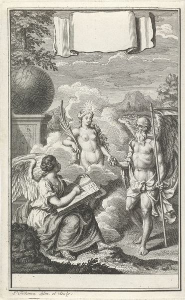 Curator: Good morning. Let’s turn our attention to "Allegorie op het huwelijk," or "Allegory on Marriage," an engraving made by Jacob Folkema in 1721. It's currently housed right here at the Rijksmuseum. What’s your immediate sense of it? Editor: A very ordered, formal feeling. All the figures so deliberately placed. It reminds me of a theatrical stage. Does that make sense? Curator: It absolutely does. Think of it like this: marriage, in the early 18th century, was not just a private matter, it was a highly performative act, often steeped in political and economic considerations. Folkema, working in that Baroque tradition, certainly captured that public-facing element. Notice the heavenly assembly in the sky… Editor: Ah, yes, they are looking down on a landscape filled with classical figures enacting this ceremony! They're surrounded by such careful landscaping as well. The couple seem to be enacting something scripted; they are barely looking at each other. Curator: Precisely! The Roman gods in the clouds preside over this transaction, literally blessing the union. It reinforces that idea of marriage being divinely sanctioned. And that woman leading the bride forward – do you notice the figures walking with her are roped together? Editor: A rather explicit symbolic gesture – literally tied to tradition! All of these details feel like deliberate communication. Like a diagram almost. It isn’t attempting any emotional resonance for us. Curator: Not so much heart-on-sleeve stuff, you are right. This work highlights marriage as an essential social and political institution. Marriage creates alliances and perpetuates family lines. Those clouds are so full of history, too, literally full of ancestors bearing down to witness their descendant join with a partner to write the future. Editor: So it goes beyond individual happiness. Jacob Folkema’s print serves as an artifact—illustrating both a binding custom of social structure and the perceived order of its world at the time, from heaven down to earth. Looking closely at these figures’ gestures has broadened my understanding. Thank you! Curator: It's been my pleasure. A closer consideration certainly brings this elaborate and symbolic print into focus, doesn’t it?