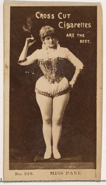 Editor: Here we have a promotional print from 1890 by the Kinney Brothers Tobacco Company, featuring Arline Stanley. I can't help but feel like the image sits at the intersection of glamour and objectification; What do you see in this piece? Curator: It’s such a compelling glimpse into the past, isn't it? It reminds me a bit of those hand-painted photographs of the era, striving for a kind of hyper-reality. I see a fascinating tension between art and commerce. Imagine being Arline Stanley, striking this pose, becoming a collectible object distributed with cigarettes. The composition—the staged background, her carefully crafted appearance—suggests an elaborate fantasy world. How do you think she felt about her image being used this way? Editor: That's a great question. On one hand, maybe it provided her with notoriety, and some degree of agency during an era when very few options were available. On the other hand, her image became completely disassociated from her personal identity. Curator: Exactly! Think about the larger context of advertising then. Tobacco companies were pioneers of using seductive imagery to reach a broader audience. Was this photograph about selling cigarettes or selling a certain kind of ideal femininity? Does it romanticize or commodify its subject? Editor: That really reframes the image. I'd been focusing mostly on Arline Stanley herself, without considering the much bigger cultural machinery at play. I realize the image's creation resulted from many stakeholders. Curator: Right, seeing how societal norms intertwine with commercial desires, you can't separate her presentation from the commercial purpose she serves here, like the actress becomes almost an allegory for longing or some elusive promise marketed alongside a dangerous habit. What do you think now, looking at it from that perspective? Editor: I see it with far more nuance. It's not just a pretty portrait. It's a cultural artifact that says so much about a very specific historical moment. Curator: Couldn’t agree more. Sometimes, the most beautiful things have the most complex stories to tell.