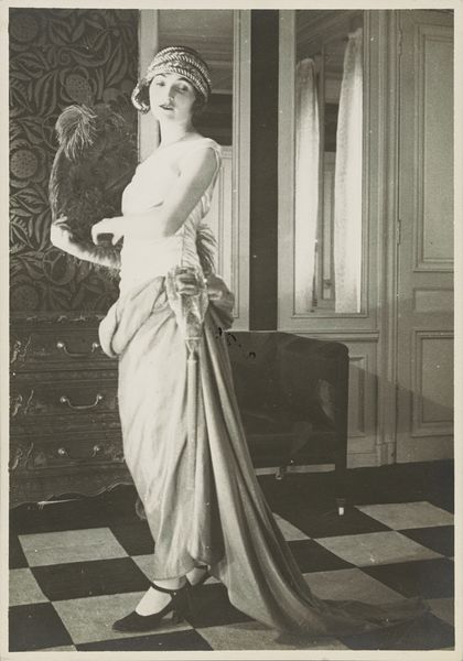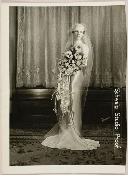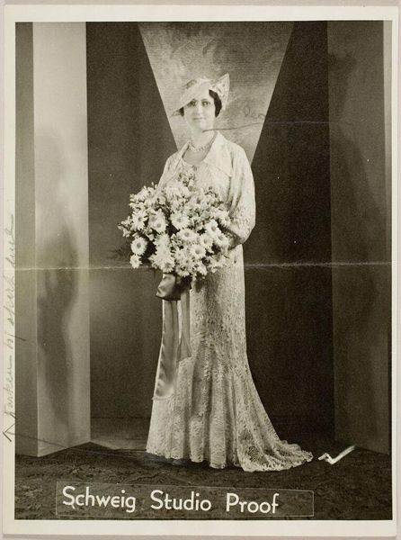 Editor: This photograph by Martin Schweig, simply titled "Untitled (woman with bouquet)," presents a woman in a gown, holding flowers. It feels very much of its time, doesn't it? I wonder, what can we read into this image today? Curator: Indeed. It’s fascinating how these kinds of portraits, seemingly celebrating feminine beauty, also subtly enforce societal expectations. The woman is adorned, almost burdened, by flowers, her gaze direct but not defiant. How might this reflect the limited roles afforded to women during that era? Editor: That's a perspective I hadn't considered. I was focused on the aesthetic, the elegance, not the potential constraint. Curator: The elegance is undeniable, but it coexists with the pressures and expectations placed upon women, especially in relation to performance, beauty, and adornment. It encourages us to look beyond the surface. Editor: I'm beginning to see how much more there is to explore than initially meets the eye. Thank you. Curator: Absolutely, and that is just the beginning of our discovery.