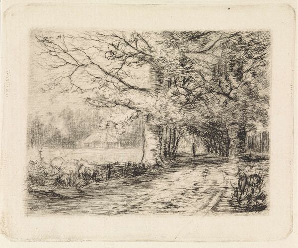 Curator: This is James Abbott McNeill Whistler’s “Greenwich Park,” an etching from 1859, now held at the Rijksmuseum. It's a fairly small work, printed on paper. Editor: There's something very tranquil about this park scene. The stark lines create a beautiful stillness, broken by the few figures placed so carefully. It makes you want to sit right there, under the trees. Curator: As an etching, the process is fascinating. The plate preparation, the acid biting, the printing – each step imprints itself materially on the image. And Whistler's choice of etching rather than painting situates this work within a larger discussion of printmaking as a medium embraced for its reproducibility and accessibility. He was clearly concerned with the making of art available outside of elite circles. Editor: Exactly! The public parks, too, were becoming accessible for recreation during that period. There's something profound in the image itself - a captured moment, reflecting the shift toward a democratization of leisure that was taking shape in mid-19th century England. And who could overlook the influence that parks and gardens of this era held over many social developments that helped shaped a cultural identity. Curator: Thinking of the material conditions of production allows us to explore further afield: the social function of prints as commodities, distributed, collected, traded...The very materiality engages a broad network of consumption. We shouldn’t shy away from acknowledging these social circuits. Editor: The image speaks volumes too, though. Take for instance the placement of those lone figures, they give the viewer a sense of inclusion in their moment. Their existence within the landscape underscores that shared sense of ownership in accessing public space, with the added visual representation making its point! Curator: I still find that foreground, so vital in pulling me into the landscape. He forces you to feel the physical space he occupies, as though you're breathing the same air. Editor: And I'm reminded again that such visual renderings are a reflection on art’s continuous ability to shape perceptions and document how those perceptions evolve over time within a public setting! Curator: Agreed. "Greenwich Park" truly captures a sense of the Victorian period, through process and product. Editor: Definitely, both historically and aesthetically enriching!