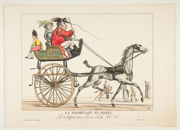 Editor: Here we have "Hobbies or Attitude is Everything, Dedicated with permission to all Dandy Horsemen," possibly from 1819, an etching by Thomas Tegg. I have to say, the first thing that strikes me is the sheer chaotic energy! Everyone looks like they’re about to fall off these early bicycles. What do you make of it? Curator: Oh, isn't it brilliant? A glorious snapshot of a very specific cultural moment – the craze for the 'Dandy Horse'. It was quite the fad amongst the fashionable set. Tegg's captured not just the 'hobby' but the 'attitude,' you see? These aren't just chaps on contraptions; they’re making a statement. Note the contrast – one guy embracing it, another petrified. Does that speak to you? Editor: Absolutely! It's almost a parody of enthusiasm. And the title feels incredibly ironic now. Was it meant to be humorous? Curator: Indubitably. Think of it as a social commentary served with a wink. Tegg was no stranger to lampooning the foibles of the well-to-do. And 'Dandy Horsemen'! A perfect label for the chaps striving for a certain… je ne sais quoi, even if it means imminent face-planting. Editor: So, beyond the humour, what’s Tegg really getting at? Curator: Perhaps it's a gentle poke at the ephemeral nature of trends. How quickly something novel becomes commonplace, or even ridiculous. The ‘attitude’ is all that matters in the fleeting moment. A fleeting moment beautifully captured, I must say. It really does give one pause to consider the human condition, doesn't it? Editor: It does. I’ll definitely think twice about my own 'dandy horse' pursuits now. Thanks for shedding light on it! Curator: My absolute pleasure. Isn't it wonderful how a little historical context can completely transform our perspective?