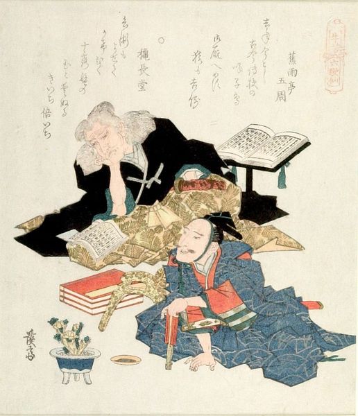 Editor: This is Utagawa Toyohiro's "Children at Play Making Mischief," a woodblock print from the Harvard Art Museums. I'm struck by the playful mood. What do you see in this piece? Curator: The bald heads and robes suggest they are acolytes, young attendants in a temple. The stick insinuates teasing, maybe even a challenge to solemnity. Consider the cultural memory: temples were not always places of utter seriousness. Editor: So, this mischievousness might have been a common sight? Curator: Perhaps. Notice the placement of the calligraphy; it almost dances around the scene. It speaks to the continuity of joy, even within structured spaces. What do you make of that? Editor: I hadn't considered the calligraphy as an active part of the composition. Curator: It underscores how symbols, even written ones, contribute to a deeper understanding. Editor: That’s really insightful. Thanks! Curator: My pleasure. It’s a reminder that art is as much about cultural history as it is about the image itself.