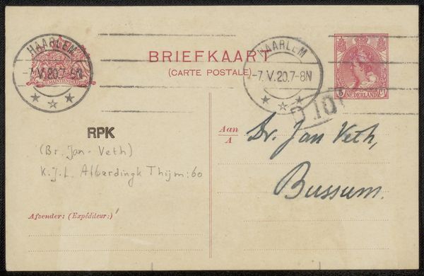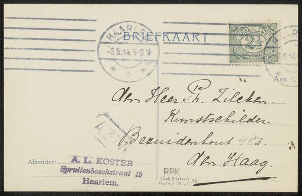 Curator: This intriguing artifact is a postcard, likely from 1909, titled "Briefkaart aan Philip Zilcken." The sender appears to be Dr. Edward B. Koster, writing in ink on paper. Editor: Immediately, I'm struck by the sheer materiality of it. The aged paper, the faded ink of the handwriting, the impression of the stamps—it all speaks of a particular time and place. There's a delicacy to it. Curator: Indeed. Postcards in the early 20th century served as vital communication tools, often reflecting social and political currents. The stamp itself, the address, they all embed specific information. I wonder, for example, what Koster and Zilcken's relationship might reveal about artistic circles in The Hague at the time. Editor: Consider the labour involved: the hand-delivery to a postal worker, the sorting, the physical journey of this small piece of paper. It highlights how we consumed information back then, a process far removed from our digital immediacy. I’d like to see if we could find the origins of the paper; that might say something about the printing processes of the time. Curator: The handwriting is so individual and it is interesting in contrast with the block printed words such as "BRIEFKAART". You know, Philip Zilcken was himself an artist of some note. It raises interesting questions about art production and consumption in relation to personal relationships and professional networks of the era. Was this correspondence a business transaction or something of a personal nature? Editor: The wear and tear on the postcard - the smudging of the ink and slight wrinkles - speak of a tangible history. We often consider artworks divorced from their life, but this piece makes that difficult; we are compelled to consider the full path. I bet there’s more to uncover about the actual inks that were used, the pigments—even those details would give context. Curator: I concur; by looking closely at the materiality and the socio-political networks surrounding this postcard, we can open doors to deeper appreciation of Edward Koster, Philip Zilcken, and the artistic communities to which they belonged. Editor: It really drives home how physical objects are packed with cultural and even individual history and it pushes me to go beyond mere aesthetics.