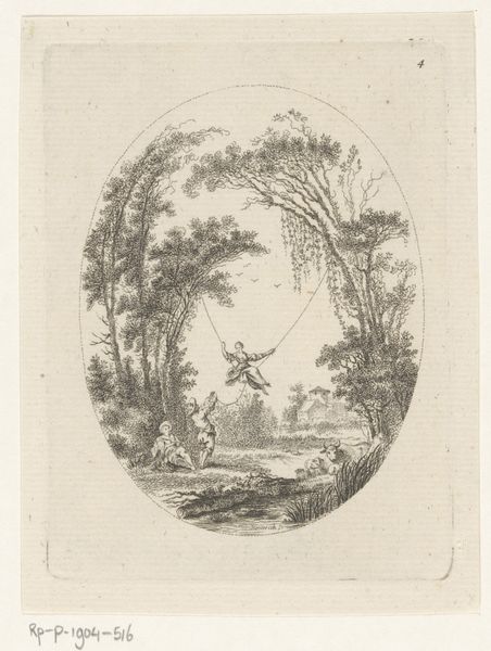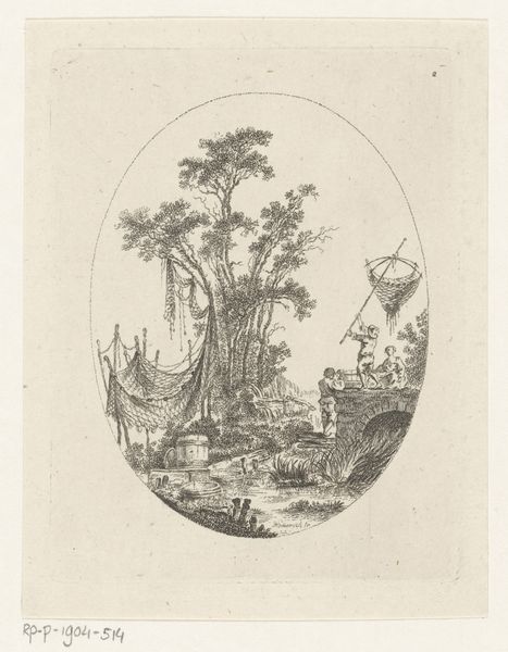 Editor: Here we have "Landscape with Women Washing Clothes on the Waterfront" by Cornelius Heinrich Hemerich, dating back to 1758. It’s a print, and I find it rather charming, with all its detail captured in this oval frame. What are your initial thoughts when you look at this piece? Curator: My gaze is drawn to the laborious act depicted. Consider the material reality of this scene: cloth, water, human effort. The women’s labor is central. This wasn't leisure; it was essential. The location, the waterfront itself, is also crucial – the material basis for this very ordinary activity. Editor: So, you see the engraving through the lens of labor and material necessity. That's interesting. Does the picturesque setting, that almost idealized landscape, contradict the reality of the work being done? Curator: Exactly! The artist is presenting a highly curated version of rural life, perhaps masking the true difficulty of accessing clean water, the roughness of the cloth, the toll this work takes on the body. How might Hemerich’s intended audience – likely a wealthier class – have perceived this image, distanced as they were from such toil? Editor: That’s a good question. I hadn’t considered the audience's perspective and how different it would be to today. Is there anything to read into the act of choosing to create a print, as opposed to a painting, perhaps? Curator: The choice of engraving, a more reproducible and accessible medium than painting, expands its reach, further disseminating this vision of labor and landscape. The very process of producing these prints would be different than painting and each mark made has importance as each one helps convey meaning and detail. Editor: I see. The material choices—the print medium itself, the depiction of cloth and water, and the realities of labour—are all interwoven. I've certainly gained a new way to appreciate the cultural meaning in this image beyond just a simple landscape. Curator: Agreed. Considering process reveals meaning.