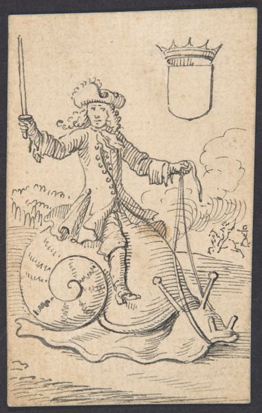 This etching is by Pieter van Woensel, created in the late 18th century. A man on crutches dominates the composition, his face contorted in anguish. He is set against a coastal landscape with ships at sea, an allusion to the dangers and uncertainties of life. The man holds aloft a flask labeled "Fly Poison," surrounded by a swarm of flies. In the upper right corner, a gallows looms. These elements, starkly rendered in simple lines, frame a scene of mortality and despair. The crutches and missing leg are more than physical afflictions; they are visual metaphors for human frailty. The swarm of flies adds to the theme of mortality, suggesting corruption and decay. Woensel uses a semiotic system where the visual elements function as signs. The man, the poison, the flies, and the gallows collectively signify the human condition, one marked by suffering and inevitable death. The composition, divided between the earthly scene and the looming gallows, underscores this duality.