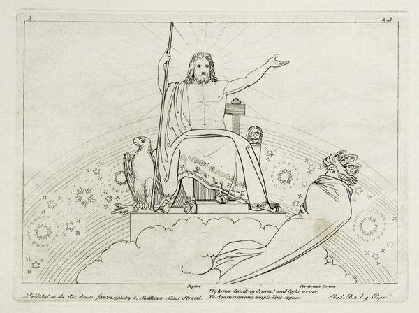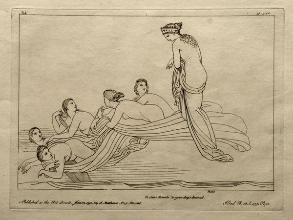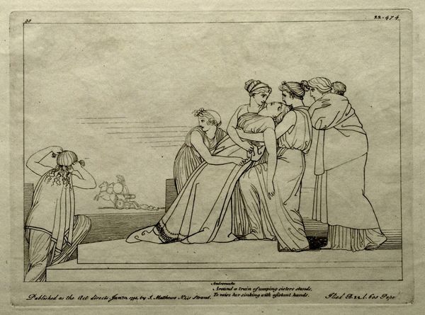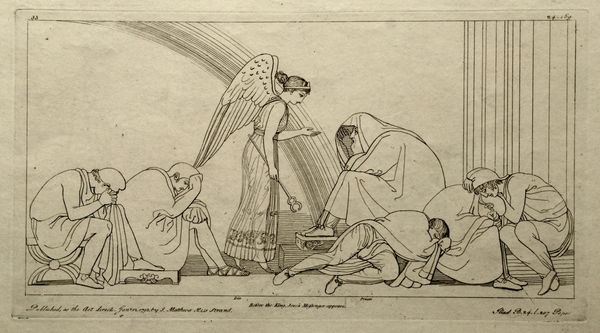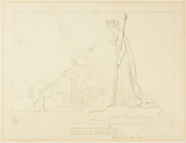 Editor: Here we have John Flaxman's "Illustration to the Iliad," created in 1795 using ink on paper. It's strikingly minimalist, almost like a line drawing etched onto parchment. The scene feels quite dramatic, with this monumental figure overseeing a chariot pulled by what appear to be powerful horses. How do you interpret this work? Curator: Ah, Flaxman! His neoclassical lines are like whispers of ancient Greece, aren't they? The image vibrates with a quiet intensity. See how the line dictates everything – emotion, form, the very atmosphere. For me, it is as if Homer's words take flight, manifested not as spectacle, but as essence. Do you sense the influence of the Enlightenment's fascination with classical forms? It's an intellectual re-imagining more than an emotional outpouring, wouldn't you agree? Almost austere, perhaps… Editor: Yes, definitely austere! There's not much detail at all, which almost pushes it toward being a symbol more than a literal representation. Was that typical of the period? Curator: Exactly! Think of it as poetry rendered visually – pared down to the essential verse. The cultural hunger for the idealized past deeply influences it, but it also serves a functional role as reproducible images, made for a booming market of printed books that popularized classics to wider audiences. Are you drawn to how he positions the characters in this visual landscape? What feelings emerge for you? Editor: It’s interesting you say “reproducible images”. Now, I feel the emotional distance—like I am supposed to appreciate it rather than be moved by it. Thanks; that helps! Curator: Precisely! And that distance, ironically, can draw us closer to the purity of the idea. It's about intellectual engagement as much as visual delight. Flaxman lets the narrative breathe. Editor: I'll definitely look at neoclassical art differently now.
