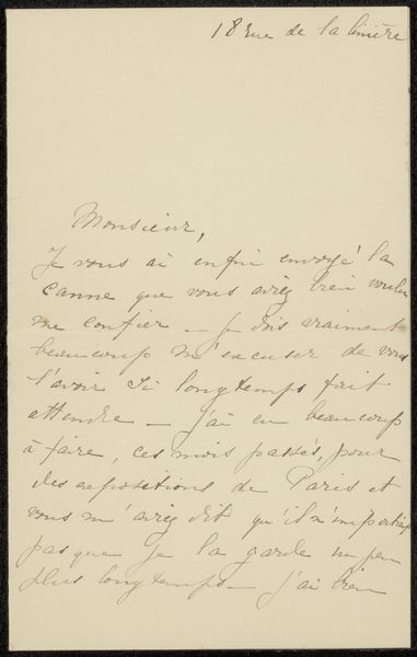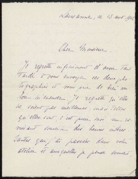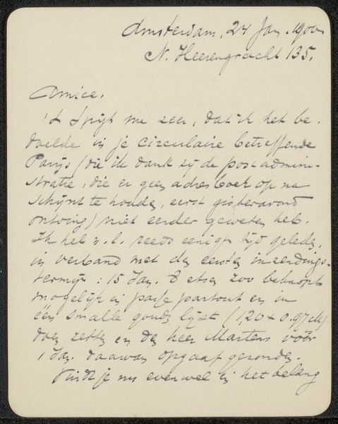 Editor: This is "Brief aan Philip Zilcken," a pen and ink drawing on paper, possibly from 1920. It gives off this intimate vibe, like we're peering into someone's private correspondence. What strikes you most about this piece? Curator: It's the vulnerability, I think. The delicate lines of the ink, like whispered confessions on aged paper. Each stroke holds the tremor of the hand that penned them, connecting us to the writer’s thoughts, their very breath. Do you feel that resonance? It almost feels intrusive to witness. Editor: Definitely, it’s not a grand statement. It’s subtle, like a secret. What do you make of the cultural context of the time, anything special that might speak through in the penmanship? Curator: I can only imagine the hushed settings in which the letter took shape. It feels like a snapshot of a quieter world where even everyday tasks held an implicit elegance. What sort of lives can you imagine Philip Zilcken and Mariette Richard lived? Were they lovers? Close acquaintances? Were the artistic endeavors more intertwined then than today, or about the same, you think? Editor: Good point. Now I wonder about the relationship implied in the language; the script looks to me like it belonged to someone older, yet it seems friendly somehow. Curator: It's not a flamboyant piece shouting for attention; instead, its strength lies in its modesty. Like finding an old photograph tucked away in a forgotten drawer and all of a sudden, feeling completely different to know that a person, like us, just happened to leave such beauty to us. You now carry their torch. Editor: Right. That personal touch definitely adds depth. I'll never look at a handwritten note the same way! It holds entire stories, captured in fragile lines. Thanks for bringing this to my attention.