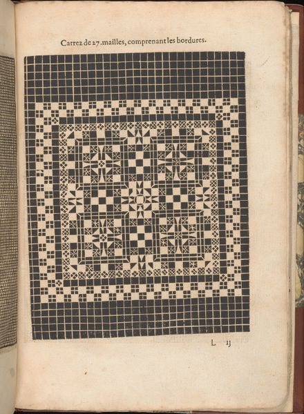 Editor: So, here we have page 47 from *Les Secondes Oeuvres, et Subtiles Inventions De Lingerie* by Federico de Vinciolo, from 1603. It's a print, an intaglio, featuring some fascinating geometric patterns. The crispness and detail are striking. What do you see as the key visual components at play here? Curator: Immediately, one notices the grid; it serves as a rigorous infrastructure. Upon this ground, Vinciolo organizes his diverse repertoire of geometric shapes. The opposition of black and white creates a play of positive and negative space, with each form meticulously balanced. Do you observe how the individual motifs relate, Editor, and how the negative and positive space interact? Editor: Yes, I'm struck by the variations within the constraints of the grid and limited palette. The squares, triangles, circles… each one feels carefully considered within its cell. Is it simply decorative, or do the repeating motifs create any specific visual emphasis? Curator: Precisely. Decoration, yes, but consider also the formal relationships between the parts and the whole. The tension arises from repetition *and* variation. Notice how certain shapes echo across the composition while others remain unique. What purpose, formally speaking, does that tension achieve? What affective properties emerge in this system of discrete forms? Editor: Perhaps a sense of restrained energy? Like a tightly controlled explosion of creativity contained within the structure. Curator: An astute observation. The success lies in this calculated deployment of form, in his mastery of line and the considered arrangement of geometric space. The grid is foundational; but what he chooses to overlay makes for an image of remarkable poise. Editor: I see it. Before, I perceived patterns, but now I see that it’s much more a game with form, structure and the push and pull between them. Curator: Precisely. It makes one contemplate what it might signify and do formally for contemporary design.
