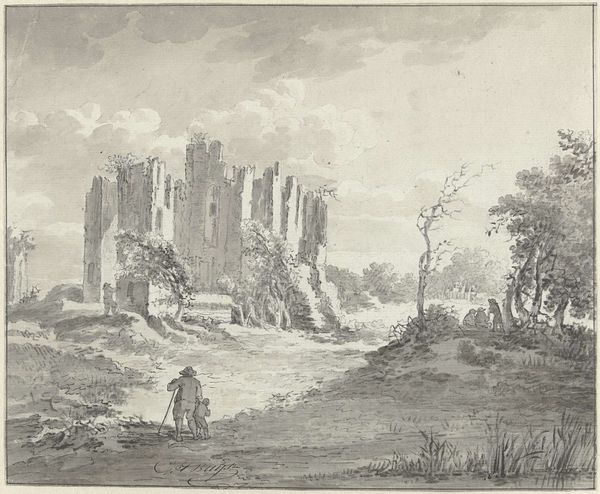 Egbert van Drielst made this drawing of the Ruïne van Brederode with pen in gray ink and brush in gray wash. Van Drielst’s delicate rendering of the ruined castle evokes a sense of nostalgia and reflection. Brederode Castle was a significant site in Dutch history, particularly during the Eighty Years' War. Originally built in the 13th century, the castle was destroyed by Spanish troops in 1573. For an artist working in the late 18th and early 19th centuries, these ruins spoke to the shifting power dynamics of Dutch society and the collective memory of conflict and resilience. The choice of a ruin as a subject is interesting. Ruins often function as symbols of the past, prompting reflections on time, decay, and the transience of human endeavors. Van Drielst’s portrayal invites viewers to contemplate the passage of time, the impact of historical events, and the enduring presence of the past in the present. The emotional undertones of the piece speak to the human connection with history, reminding us of the layers of memory embedded in our landscapes.