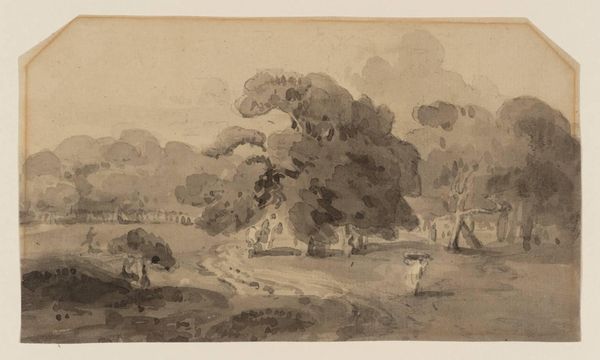 Editor: This is "A Study" by John Sell Cotman. It's an undated print from the Tate Collections. There's something so peaceful about this landscape. What can you tell me about it? Curator: Landscape motifs often symbolize a search for Arcadia. Notice how the trees frame the distant city? What does that juxtaposition suggest about humanity's relationship with nature, and the encroachment of civilization upon it? Editor: It makes me wonder if the artist is trying to say something about progress. Curator: Precisely! The figures walking, the architecture… They all become symbols of change, viewed through the lens of the natural world's enduring presence. Perhaps Cotman is reflecting on what is lost, and what remains. Editor: That gives me a lot to think about, especially about the symbolism of nature itself. Curator: Indeed. Every element contributes to a larger narrative, echoing cultural anxieties and aspirations through visual form.