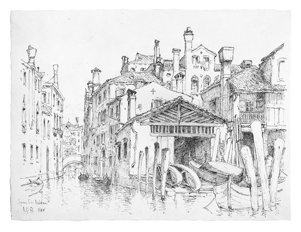 Andrew Fisher Bunner’s ‘Rio del Forner, Venice’ is a drawing rendered in ink on paper, presenting a view down a narrow Venetian canal. The composition is dominated by vertical architectural forms, closely flanking the waterway, creating a sense of enclosure. The artist employs intricate line work to define the buildings, capturing the textures of aged stone and the reflections in the water. This evokes a feeling of quiet introspection. Bunner uses hatching and cross-hatching to model forms and create depth. The linear perspective draws the eye towards the archway in the distance, suggesting an opening and a continuation of the canal beyond. The precision of the line work and the attention to detail place the work within a tradition of topographical drawing, yet the artist’s expressive handling of the medium also hints at a more subjective, emotional response to the scene. Ultimately, the drawing functions as both a record of a specific place and an exploration into the interplay of light, shadow, and architectural form. It invites us to consider how such formal elements shape our perception and understanding of space.