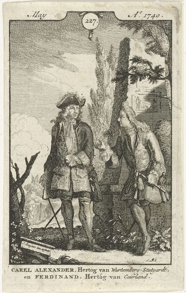 This print of two historical figures in conversation was made by Simon Fokke in the 18th century, using etching. The magic of etching lies in its ability to capture incredible detail. It starts with a metal plate coated in wax. The artist then scratches through the wax, exposing the metal, which is then submerged in acid. This process bites into the metal, creating lines that hold ink. The longer the plate sits in the acid, the deeper the lines and the darker they will appear in the print. It’s a meticulous and skilled craft. Consider how the etched lines define the characters and their clothing, creating areas of light and shade that give them volume and presence. The artist has used the qualities of the etched line to bring these figures to life, and even to suggest the feel of different fabrics and textures. This print, like many from the period, was likely produced as part of a larger series of historical illustrations. It exemplifies how the skilled labor of printmaking played a vital role in disseminating information, shaping cultural narratives, and bringing historical figures to life for a wider audience.
