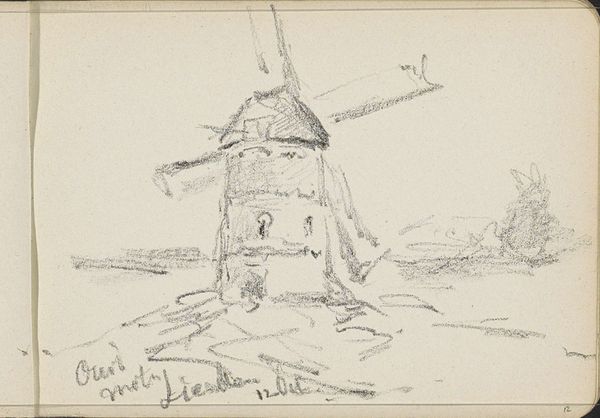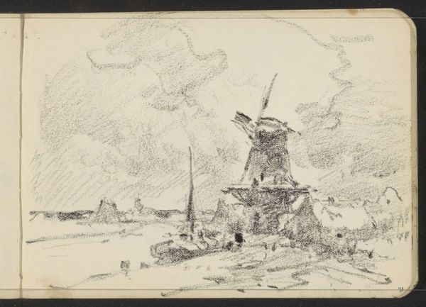 Editor: This is "Landscape with Windmill at Lienden," a drawing, possibly from between 1866 and 1922, by Willem Cornelis Rip. It’s a graphite and pen sketch. I’m struck by how desolate and stark it feels, yet somehow balanced, too. What do you see in this piece, looking at its construction? Curator: The sketch's power lies in its formal arrangements, doesn't it? Note how the artist balances the composition. The windmill isn’t quite centered, pulling our eye subtly towards the right, counterweighted by the foreground textures. This deliberate asymmetry generates a visual interest, prevents it from becoming static. Editor: So, the placement of the windmill creates tension, but the artist resolves it with the… foreground? Curator: Precisely. Examine the materiality, the tangible qualities of the graphite. See how Rip uses short, energetic strokes to define form, suggesting depth with the lightest touch. The restricted palette forces the eye to focus on the variations in texture, line weight, and composition, yes? Editor: It’s not just a flat image. The varying pressure of the graphite really gives the impression of receding space, despite the minimal detail. I suppose I see how he created a sort of ordered, pictorial space. Curator: Exactly. And that space is defined not through mimetic representation, but through purely formal relationships – line, tone, composition, balance. By studying how these elements intersect, can you perceive his art? Editor: Yes, now that I’m thinking about the relationship between all of the artistic choices you mentioned and how those shape the whole composition, I have a better idea. Thank you. Curator: A careful attention to formal vocabulary expands our ability to read the world.