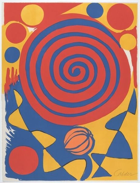 Editor: This is Ralph Cornell Seigle's "Jack in the Box," from 1946, looks like acrylic paint and print. It feels almost like a flattened circus poster with its primary colors and playful geometric shapes, yet there’s something unsettling about that grinning face. What catches your eye? Curator: I am intrigued by the visible traces of its making. You see the inherent limitations within printmaking itself. Mass production promises endless copies, yet each print carries slight imperfections, misalignments, or variations in ink density, all telling of the physical labour and industrial processes inherent in its construction. Editor: So, you're seeing the human hand, or the machine's, even within the 'perfect' repetition? Curator: Exactly. And acrylic paint from that time would've carried a distinct texture and sheen compared to paints manufactured today, affecting our perception of depth, colour saturation and therefore influencing our perception of form. Its very materiality contributes to the message. Think, too, about access: Were these high quality materials? Does the choice of media relate to economic limitations for the artist? Editor: I hadn't thought of that, how the availability or affordability of materials dictates the art that’s made. Curator: These weren't just choices about aesthetics, they were decisions deeply entwined with the post-war landscape, industrial production and perhaps the artist's own financial circumstances. I wonder about his relationship with this medium… was printmaking a path of least resistance, or did its affordances lead to certain material experiments? Editor: Seeing it this way shifts everything. It is not just a design anymore. I need to consider not just 'what' but 'how' it was created to even begin understanding it! Curator: Precisely. Materiality always matters, as that informs and impacts the means of production. We gain fresh perspectives on the context around the artist, the labor that produced "Jack in the Box," and that changes its story completely.
