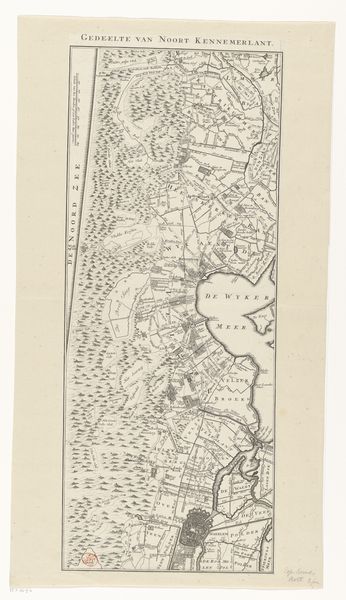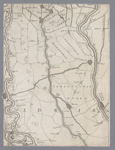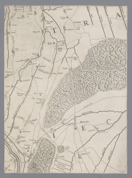 Editor: This is a section of "Kaart van het Hoogheemraadschap van Delfland, met Schipluiden en Maasland", made between 1611 and 1692 by Floris Balthasarsz van Berckenrode, a Dutch Golden Age drawing using ink. The intricate details are amazing, but I'm curious about how it functions as a work of art. What can you tell me about its purpose and creation? Curator: Well, consider the materiality of this map. It's not simply a representation of land; it's a document deeply intertwined with labor, resource management, and the social power structures of the Dutch Republic. Editor: In what way? Curator: Think about the physical process of creating this map. Surveying the land required skilled labor. Transferring those measurements to paper, meticulously rendering each polder and waterway in ink, was painstaking work. These are not simply abstract lines. This process embodies the exploitation and capital involved in the dutch landscape. This whole procedure demonstrates control of water systems. It allowed control over resources and trade which resulted in accumulation of vast wealth. What impact did all this landscape management have, do you think, on communities or social change? Editor: So, understanding the means of production allows us to examine not only art but broader questions related to economics and societal structures, rather than focusing solely on aesthetic or artistic values. It seems less about the land itself and more about control. Curator: Precisely. Consider how these polders—carefully drained and managed lands—were directly tied to wealth creation. What appears to be a neutral depiction of geography is, in fact, an endorsement of Dutch enterprise, colonial endeavors, and emerging capitalistic systems. This challenges us to question who benefited from all of this labor and technology and on whose labor the prosperity of Delfland rested? Editor: I see how considering material realities and process brings new dimensions to understanding this work beyond just its visual appeal. Thank you for illuminating the links to materiality, economy, labor and historical context. Curator: It allows us to investigate broader questions. My pleasure.
