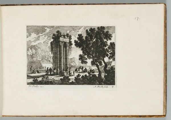 Curator: Hubert Robert, known for his capricci, gives us "Plates III and IV of Les Soirées de Rome" with these twin etchings of imagined Roman ruins. Editor: The mood is definitely melancholic, isn't it? All those crumbling columns... You can almost hear the whispers of forgotten empires, printed on what looks like laid paper. Curator: Robert was very interested in the contrast between the grandeur of classical architecture and the inevitable decay brought about by time and nature. Think of the labor that went into quarrying, transporting, and erecting these stones! Editor: I see the ink clinging to the paper fibers, giving it a tactile quality. It makes me wonder about the etcher’s hand, the pressure, and the acid's bite on the metal plate to create these lines. Curator: Robert often incorporated figures into his ruins, inviting us to contemplate our own place in history, perhaps hinting at cycles of creation and destruction. Editor: Cycles, yes... but also the tangible processes of creation, decay, and recreation. It's all there in the materials themselves. Curator: A dance between impermanence and the lingering echoes of human ambition. Editor: A dialogue that history continues to write, line by etched line.