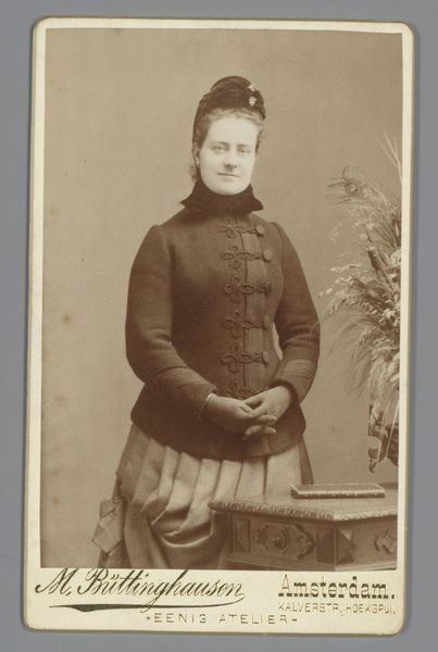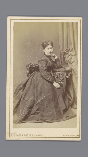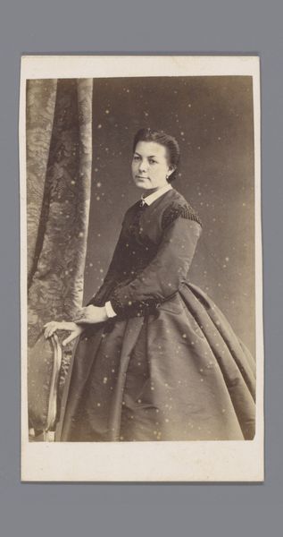 Achille Ernest Mouret made this small photograph, titled "Portret van een onbekende vrouw bij bloementafel", with a painterly eye. In the 19th century, photography emerged as a powerful tool for representation. Here, we see a woman who is both present and distant. Her identity is unknown, yet her image is meticulously preserved. The flowers on the table beside her add an air of delicacy. Mouret, identified at the bottom as "Peintre de Miniatures", highlights the interplay between painting and photography. The woman's dress speaks to the era's expectations of femininity and modesty. Yet, her gaze challenges traditional notions of women's roles. What emotions and thoughts lie beneath her composed exterior? The photograph invites us to reflect on the complex relationship between representation, identity, and the gaze. It serves as a reminder that every image carries within it a story waiting to be discovered.