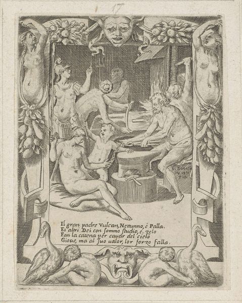 Curator: Looking at Elihu Vedder's "The Heavenly Potter" created around 1883-1884, what strikes you immediately? It’s rendered in colored pencil and pencil. Editor: There’s something profoundly melancholic about the palette, that pervasive grayness. It's almost like looking at a faded photograph. I am instantly thinking of power and the shaping of beings and our very identities by power structures. Curator: Vedder was very invested in the craft of illustration, note the attention to the materiality of the different elements – clay, stone, tools. His engagement with different artistic communities during this time is also very apparent. Editor: Yes, and situated within the late 19th-century Symbolist movement, this artwork certainly opens avenues for thinking about divine authority in how it’s composed here. It's also reminiscent of earlier allegories involving Prometheus creating the first human from clay. It reflects ideas about creativity and power structures in society. The verse and accompanying imagery both invoke themes about our creation and relationship with labor. Curator: The tools, too, play a role. The placement of the urn and spade at the bottom suggest processes. And the writing incorporated acts as text/image component. Editor: Absolutely, it's intriguing how Vedder intertwines image and text. He layers meanings about divine creation, social power, and material existence. We also see some ideas relating to consumption, given his reference to cups and earth. Curator: Vedder was clearly invested in the spiritual and the everyday. This is evident in his rendering style, but the muted palette subverts what we know of divinity and power. Editor: Indeed. And while this may allude to humanity's origins, it also presents some potent commentary on social strata. I am thinking of hierarchies of production in industrializing societies. Curator: A potent intersection indeed between craft and higher philosophical themes, isn't it? Editor: Precisely! It's an exploration of the complex interdependencies between spiritual narratives, material culture, and identity in ways that reverberate today.