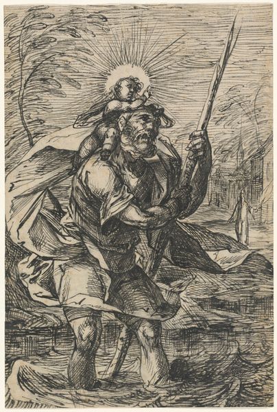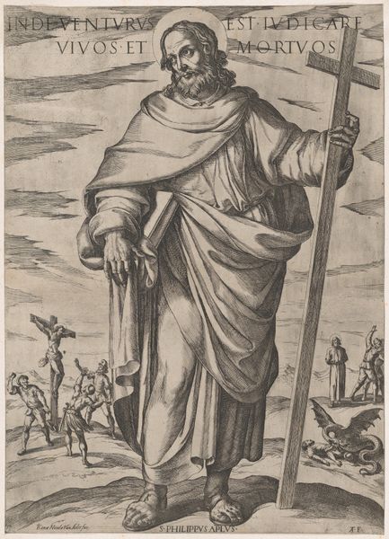Editor: This is Sebald Beham's "Saint Sebald," an engraving from 1521. There's something serene yet imposing about this figure; he seems both worldly and ethereal. What jumps out at you? Curator: Well, immediately, the weight of symbols strikes me. Consider that miniature church he holds: not just a building, but the Sebalduskirche itself, the spiritual heart of Nuremberg, his city. The pickaxe on his hat anchors him to labor, a grounded holiness, yet the halo speaks of transcendence. Editor: So, the pickaxe isn't just random? I thought it was a peculiar detail. Curator: Nothing is random, especially not in such a carefully constructed image. Think of how visual symbols communicated across generations; this pickaxe wouldn’t have seemed odd to its contemporary viewers. Now look at the shackles around his ankles - a symbol of release. Editor: That's fascinating, I didn't notice the shackles initially, I was focused on his stern face. Curator: Faces can mislead, eh? Visual artists in that period are very intentional, particularly with iconographic images. He stands with bare feet on the stone - his connection to his physical surrounding; with that simple walking stick. It is at once staff of power but it points down to the world, to Nuremberg itself. Editor: I see how those visual elements add layers of meaning that you might miss at first glance. Thanks for opening my eyes to this; the shackles gave me a different context. Curator: Indeed, these aren't just images but encoded memories and belief. It will be interesting for you to spot these on your own from now on!
