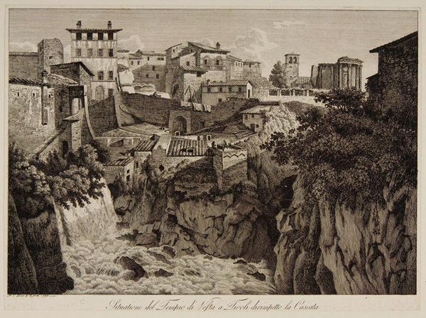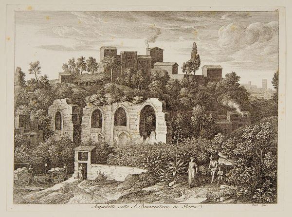 Curator: I’m struck by the dramatic chiaroscuro in this print; the stark contrast really emphasizes the decay. Editor: This is Joseph Anton Koch’s "Ruins of the Palace of the Caesars in Rome," and it’s precisely that decay that interests me. The ruins represent more than just architectural decline, don't you think? Curator: Of course, it’s a commentary on the transience of power. Koch masterfully uses line and form to highlight the grandeur that once was. Note the architectural elements, and how they are framed. Editor: Absolutely, the composition draws our eye upwards, but it's the human figures that ground the scene, reminding us of the social realities built atop that history, and those ruins, particularly the figures that appear to be women. Curator: Yes, that layering is key. The diagonal lines guide us through the composition, creating depth and visual interest. Editor: It's a powerful statement about history, power, and who gets to write the narrative. Curator: Precisely, a somber reflection realized through skillful draftsmanship. Editor: Indeed, the piece encourages us to think critically about the narratives and the human cost behind these grand structures.