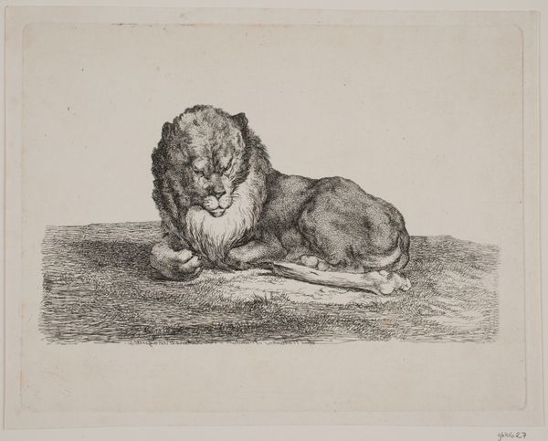 Curator: The first thing I notice about this graphite drawing is the tenderness, an almost melancholic stillness about it. The dog, rendered with such detail, seems to carry a weight. Editor: Well, the lines, while detailed, are creating a fairly relaxed, almost listless, posture in the animal. It’s horizontal, stretched out…it leads the eye smoothly from left to right, guided by the dog’s own languid form. The tail just fades out of view, almost unresolved. Curator: Yes, ‘Sleeping Dog’ by George Jooss, made around 1827, is remarkably understated. Given how long dogs have been symbolic companions – guardians, guides to the underworld, even deities – one can't help but read into its slumped form a broader statement on vulnerability or perhaps even the quiet exhaustion of the Biedermeier era. Editor: Perhaps, but look at the technique. Jooss is masterfully using varied line weights to build the animal's form, isn’t he? You see it most in the mane and fur, the way he achieves volume and texture with essentially just hatching and cross-hatching. It’s economical, and so effective. There is texture through those short and controlled lines. Curator: True. Consider the psychological weight dogs held, their association with loyalty and fidelity. Jooss invites reflection, using an animal burdened by these attributes and the burden of existence to engage the human condition. Editor: Perhaps what we’re seeing reflected back to us is less the weight of the human condition and more about the dog’s innate ‘dogness’. It isn't burdened; it’s sleeping! I admire its clarity and economy; nothing is overwrought. Curator: Ultimately, isn't art about finding echoes of ourselves in unexpected places, even in the slumber of a dog immortalized in graphite? Editor: Perhaps. Though I appreciate the beauty of a deceptively simple sketch made so poignant by careful detail.